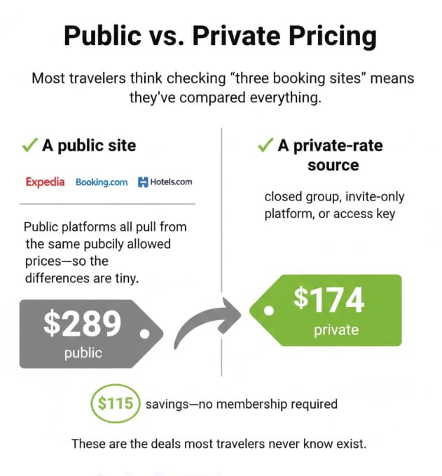 Travelers who know how to access these private rates consistently pay less—no fees or credit cards required.
